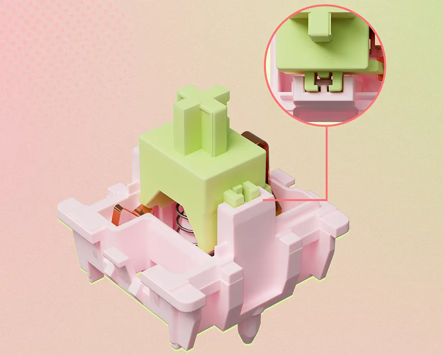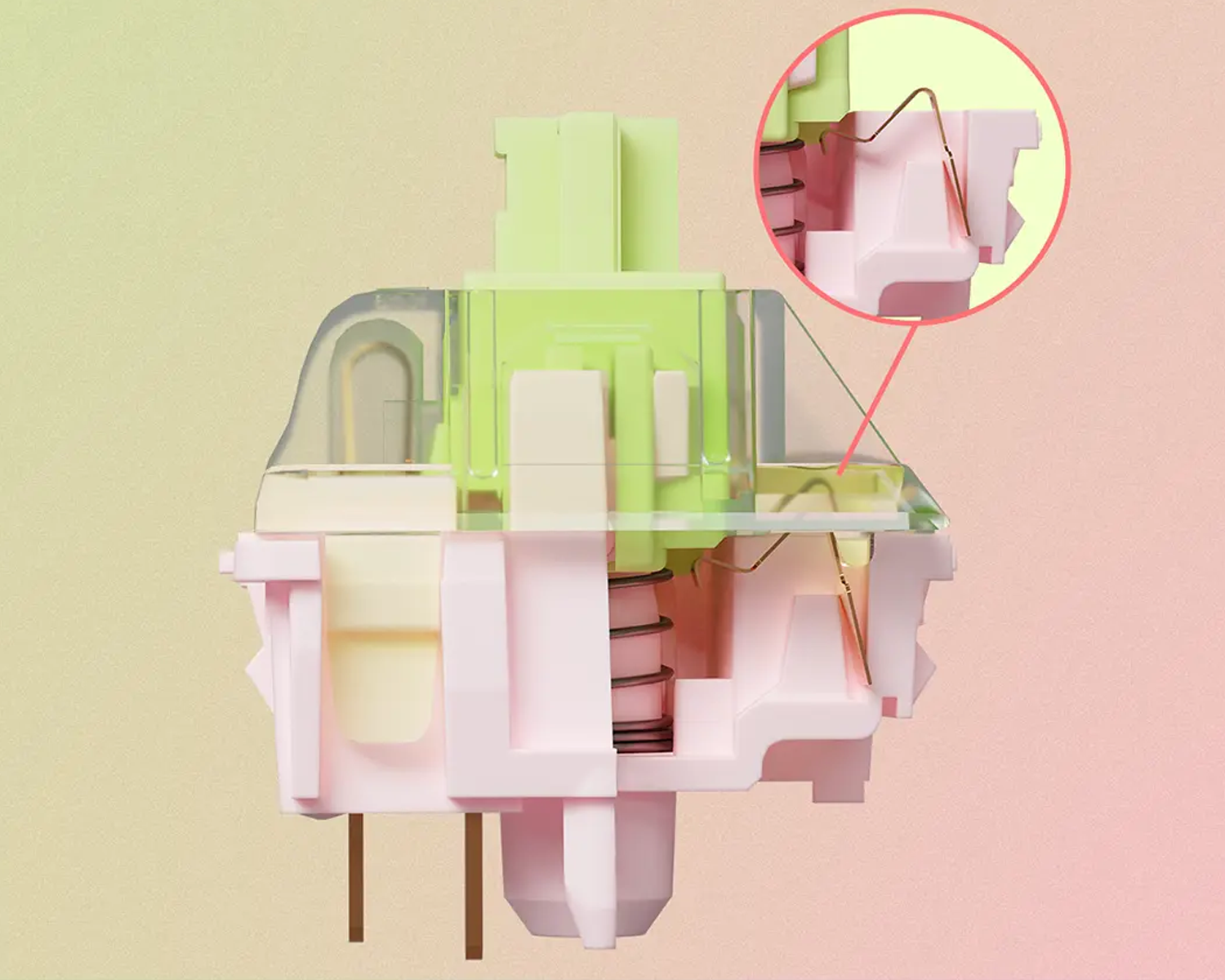 Çift raylı mekanizma, her tuş basımında yüksek stabilite ve pürüzsüz bir hareket sunar. Bu yapı sayesinde clicky karakter daha net, daha temiz ve dengeli bir ses profili oluşturur.