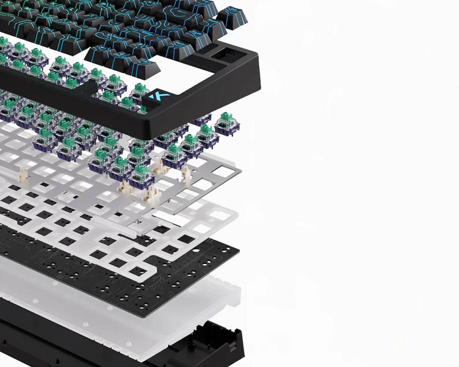 Silikon ses emici katmanlar ve silikon alt ped, tuş seslerini azaltarak daha temiz ve kontrollü bir yazım deneyimi sunar. Alüminyum alaşımlı konumlandırma plakası ise her basımda daha net geri bildirim ve daha yüksek stabilite sağlar.