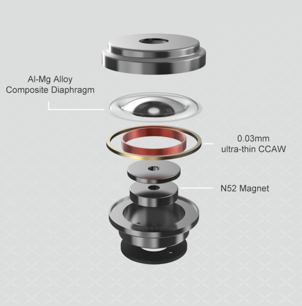 Kubbe diyafram materyali olarak, Alüminyum-Magnezyum alaşımı yüksek sertlik ve hafif ağırlık sergiler, böylece tiz bant genişliğini uzatır ve daha ince detayları ortaya çıkarır. Diyafram süspansiyonu, farklı özelliklere sahip iki polimer malzemeden oluşur, bu da daha tok bir bas ve büyük ölçüde azaltılmış doğrusal olmayan bozulma ile sonuçlanır.