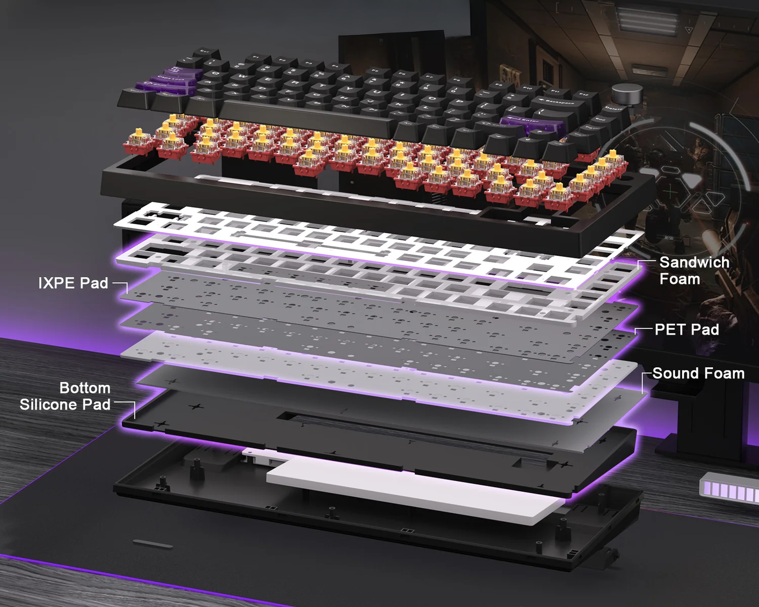 5 katmanlı iç dolgu yapısı (silikon sandviç, IXPE, PET, ses emici pamuk ve alt silikon) sayesinde klavye daha tok, dengeli ve yumuşak bir yazım hissi sunar.