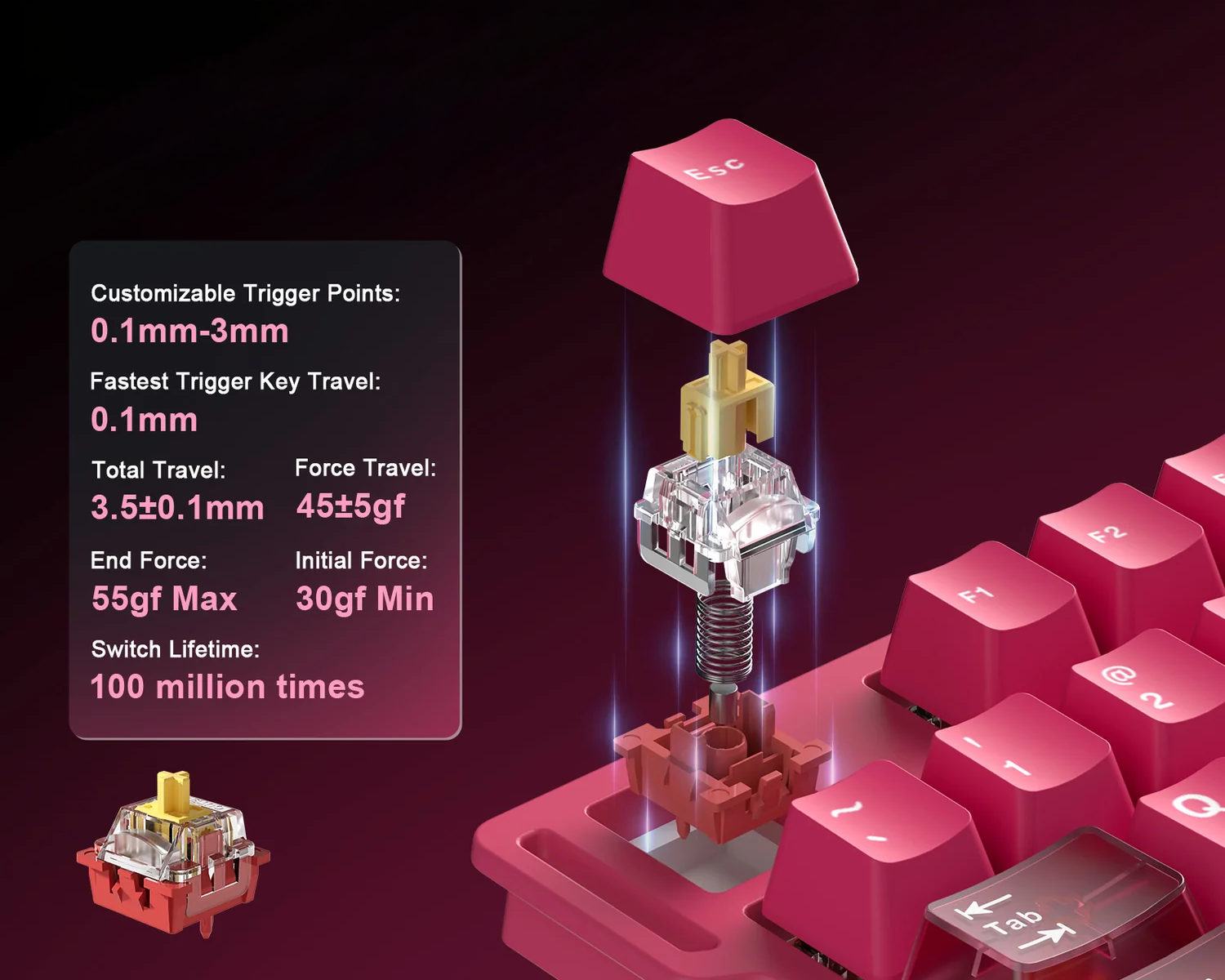 Hall Effect switch, tuşların tetikleme noktasını 0.1 mm – 3.0 mm arasında ayarlamaya imkân verir. Manyetik algılama sayesinde temas aşınması olmaz, kısa basışlarda ultra hızlı, derin basışlarda daha kontrollü bir kullanım sağlar.