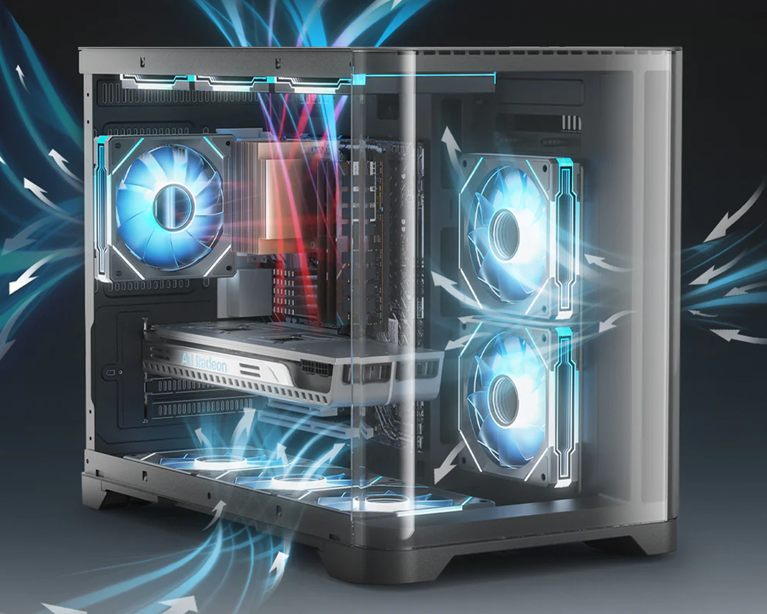 PWM ve ARGB bağlantıları sayesinde fan hızı ve aydınlatma efektleri üzerinde tam kontrol sağlar. 9 kanatlı fan tasarımı titreşim emici kauçuk pedler hava türbülansını azaltarak daha sessiz ve stabil bir çalışma sağlar.