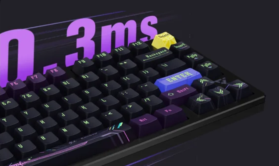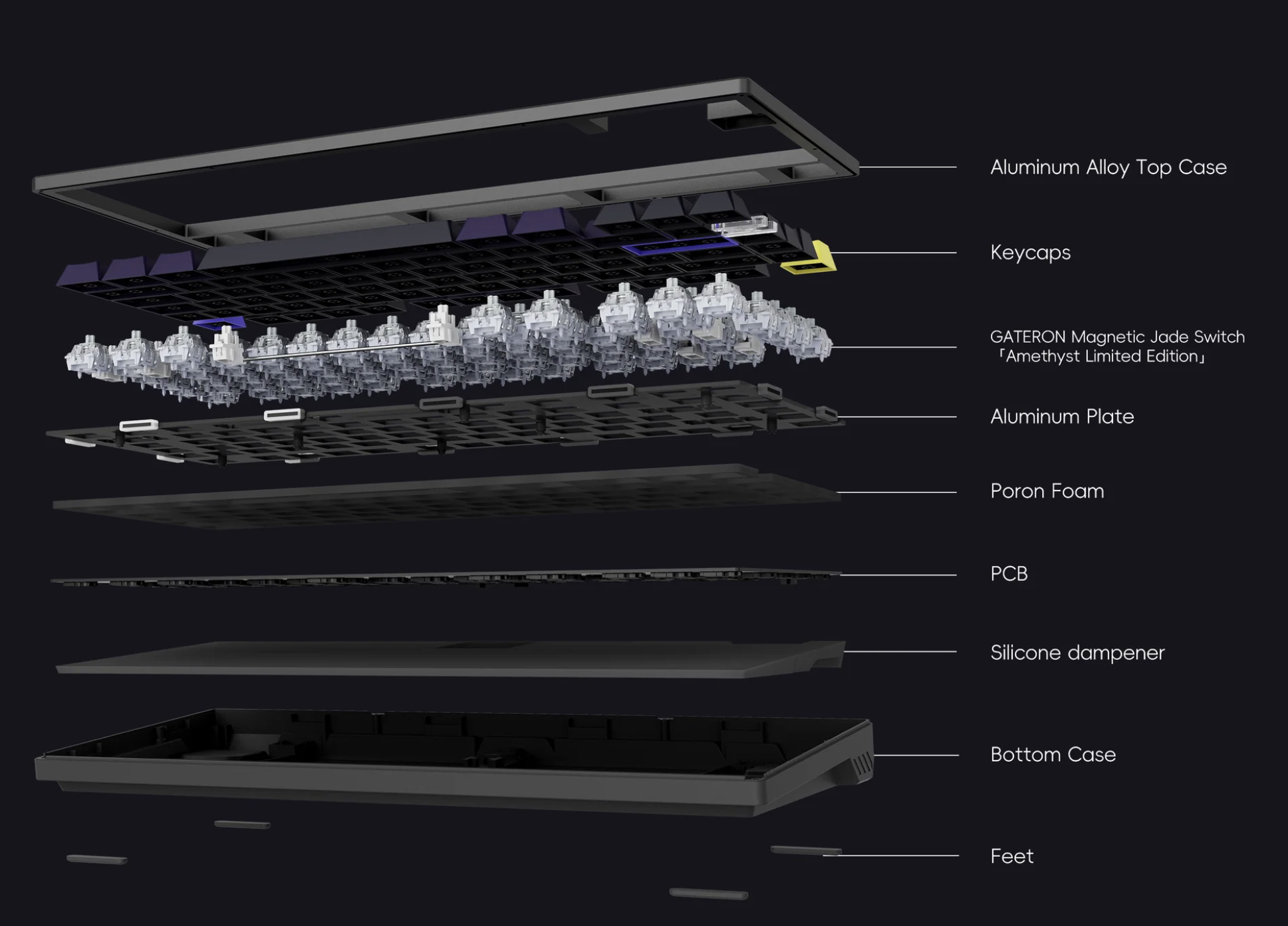 RS7 serisinde segmentinin en üst seviye manyetik switch'i olan Gateron Jade'in özel olarak üretilmiş Amethyst Limited Edition versiyonu kullanılmaktadır.