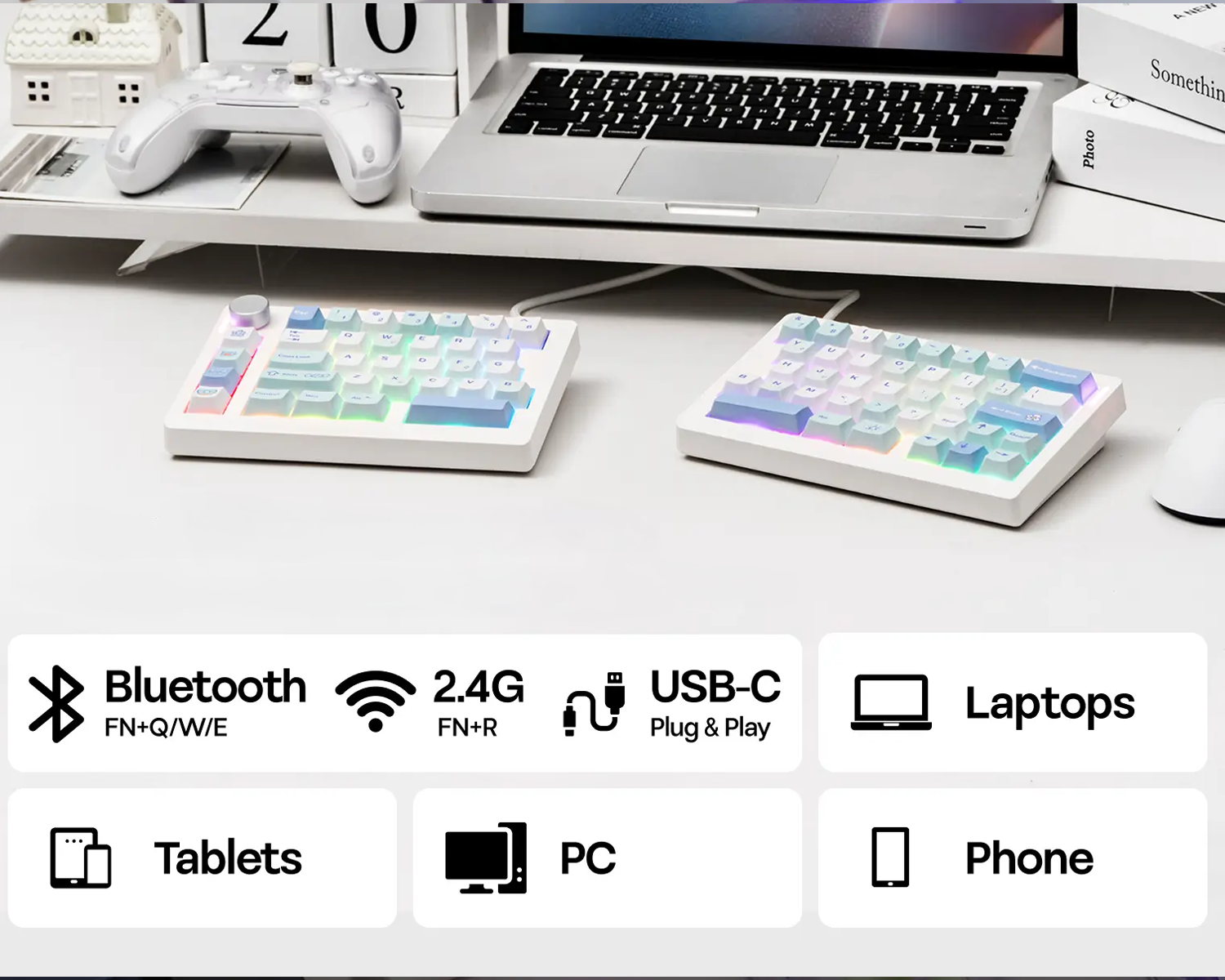 Kablolu, 2.4G kablosuz veya Bluetooth kullanarak tüm aygıtlarınıza rahatlıkla bağlanabilir ve ekstra uğraş olmadan klavyenizi kullanmaya devam edebilirsiniz.