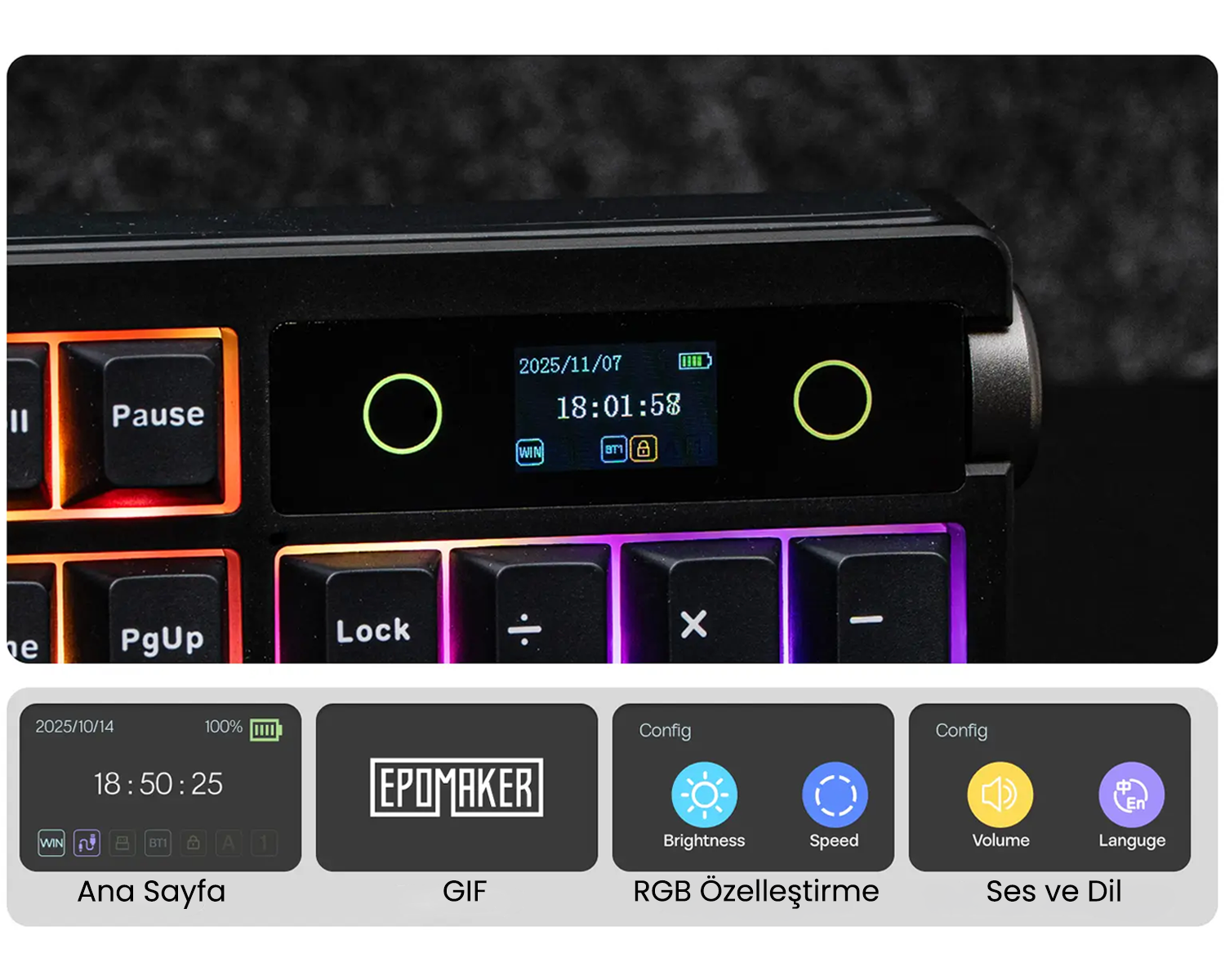 Akıllı ekranı sayesinde saati her zaman görebilir, istediğiniz GIF'i yükleyebilir, rgb ve ses, dil özelleştirmeleri yapabilirsiniz. Ekran yanında bulunan knob kullanarak ses ayarlaması yapabilirsiniz.