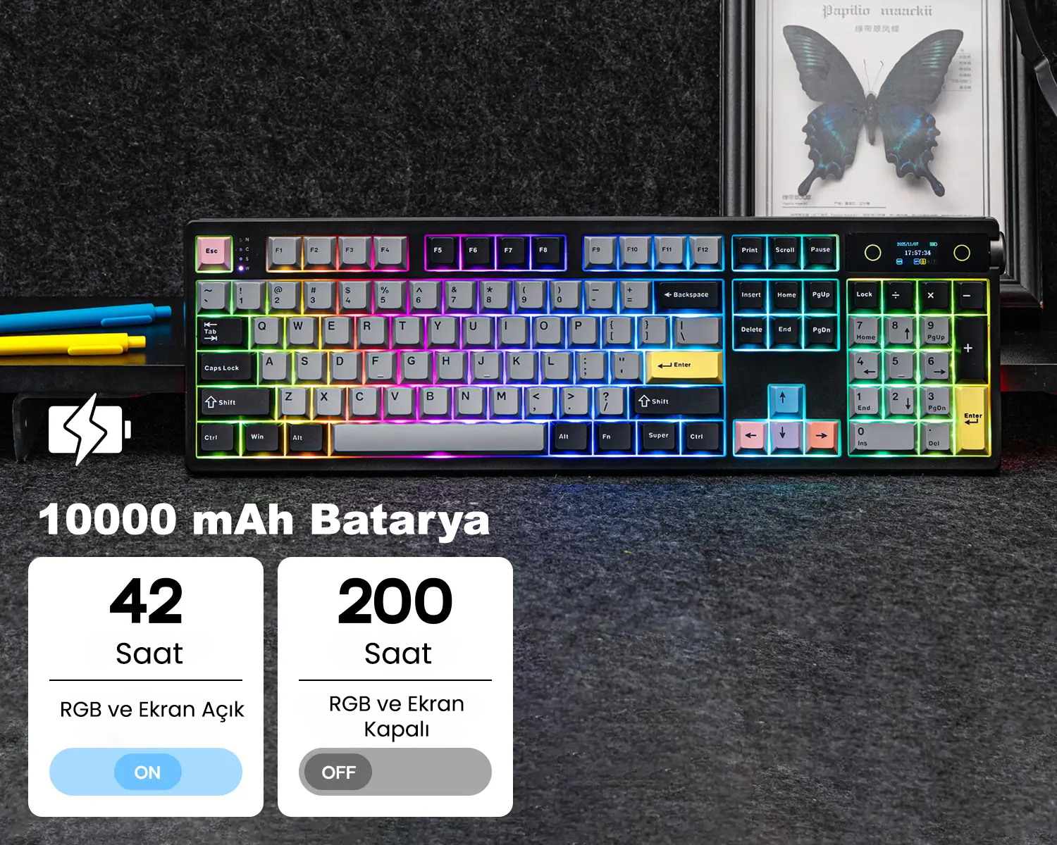 10000 mAh devasa bataryası sayesinde ekran ve RGB açık 42 saat, ekran ve RGB kapalı ise 200 saate varan kullanım süreleri elde edebilirsiniz.