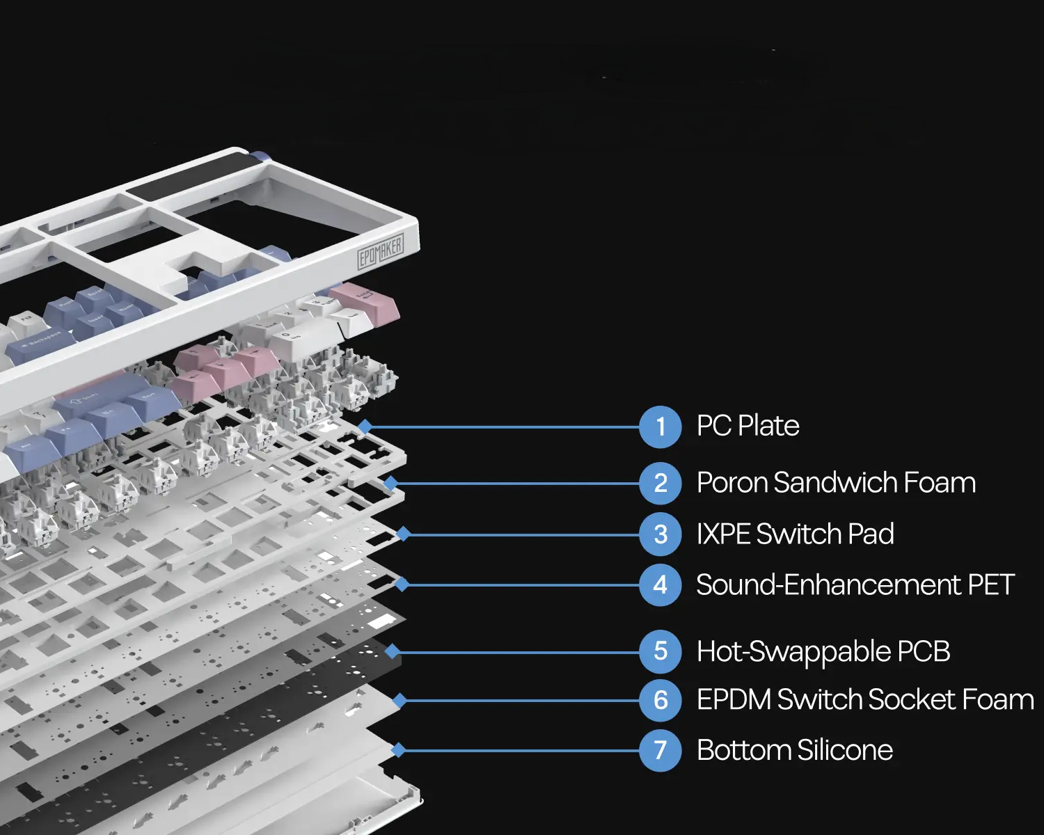Sandviç köpük, IXPE switch pad, ses iyileştirici PET katman, EPDM switch soket köpüğü ve alt silikon kombinasyonu; rezonansı azaltır, dip vuruşlardaki sertliği emer ve daha kremsi bir ses karakteri oluşturur.