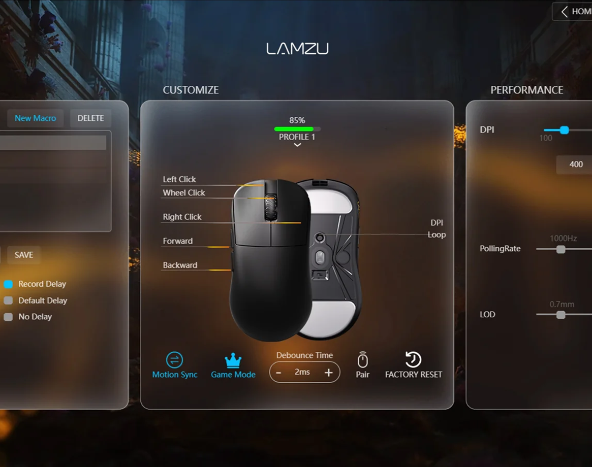 Tarayıcı üzerinden erişebilen Lamzu Aurora yazılımı ile herhangi bir indirme yapmadan DPI, LOD ve polling rate gibi ayarlar kolayca değiştirebilir.