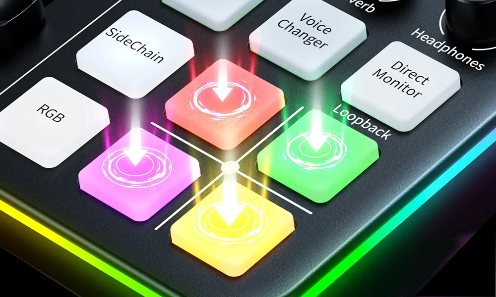 48V Phantom Power, Tek Tuşla Susturma, 2 Level Gürültü Engelleme, Loopback, Soundpad, Ses Değiştirici, Mikrofon Ses/Gain Ayarı