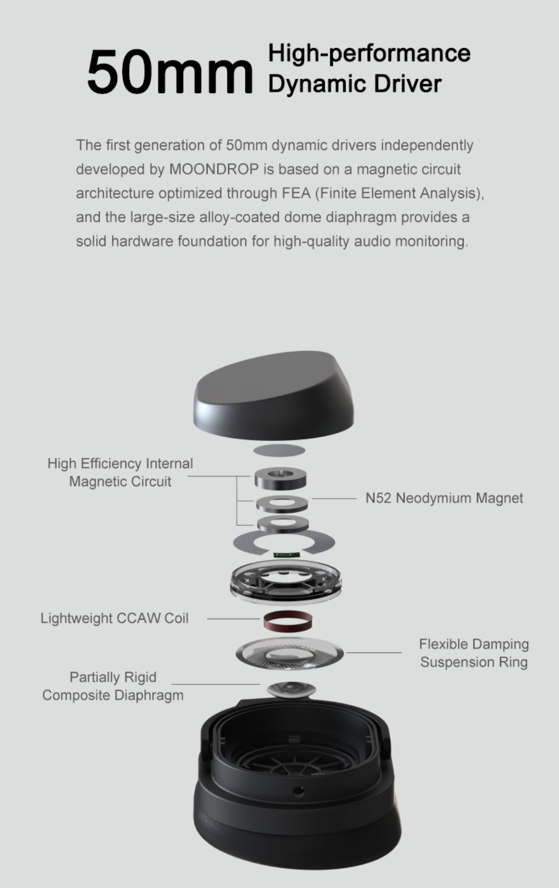 MOONDROP tarafından bağımsız olarak geliştirilen 50mm dinamik sürücülerin ilk nesli, FEA (Sonlu Eleman Analizi) ile optimize edilen bir manyetik devreye dayanmaktadır. Büyük boyutlu alaşımlı kaplamalı dome diafram, yüksek kaliteli ses izlemesi için sağlam bir donanım temeli oluşturmaktadır.