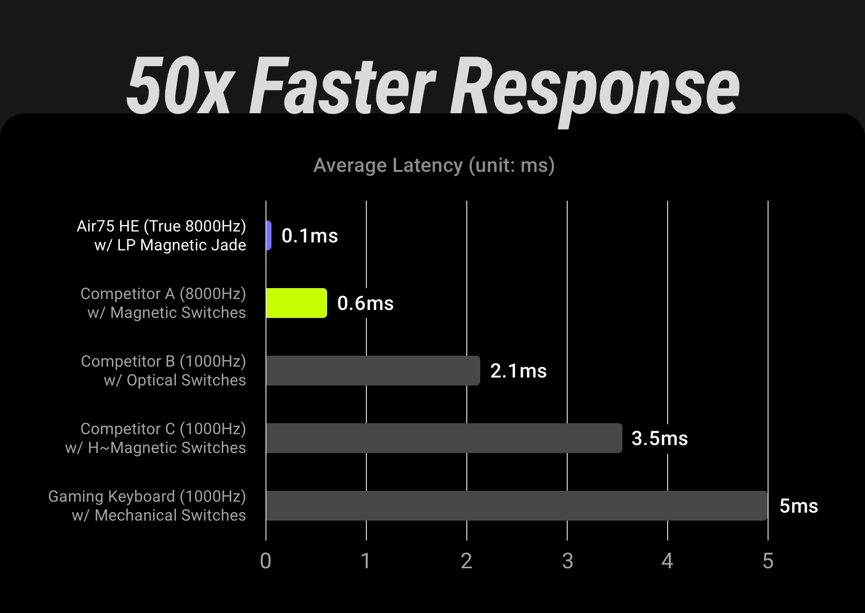 Air75 HE, dünyada hem 8000Hz polling rate hem de 8000Hz PCB tarama hızına sahip ilk alçak profilli klavyesidir. Gecikmesi, çoğu 8000Hz manyetik switch klavyeden önemli ölçüde daha düşüktür ve geleneksel oyun klavyelerine göre 50 kat daha hızlı yanıt süresi sunar.