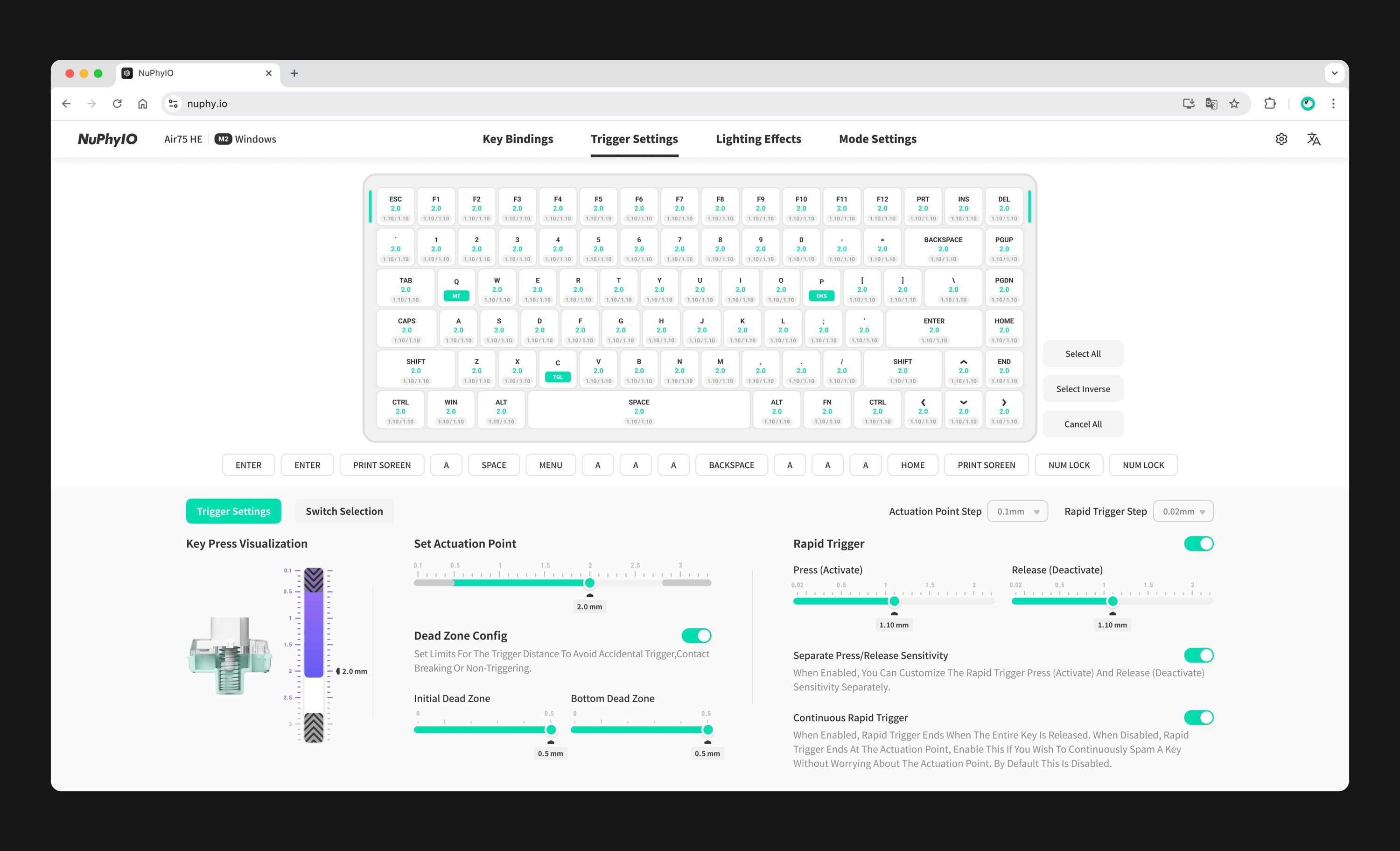 NuPhyIO web sürücüsü sayesinde, sistem performansını etkileyen her parametre ayarlanabilir ve bu ayarlamalar, klavye önizlemesinde tuş bazlı olarak rapid trigger/hassasiyet gibi gerçek zamanlı olarak kullanıcı arayüzünde etki ederken görülebilir.