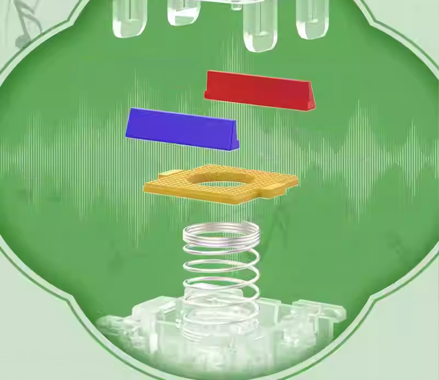 Manyetik switchlerde ortaya çıkan sert çarpma hissi, switchin iki yanına yerleştirilen elastik yapı ile sönümlenir.