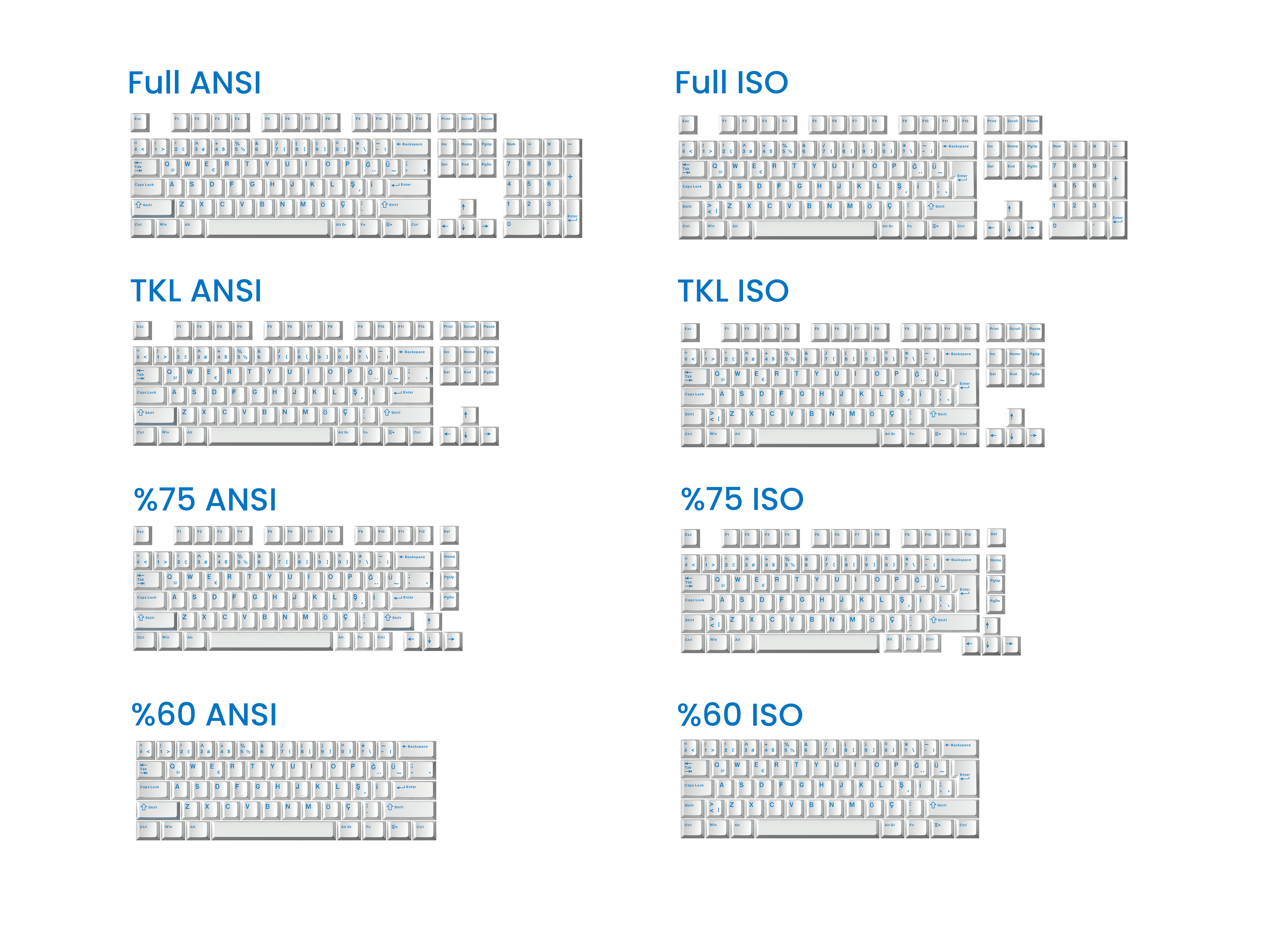 Tam boy, TKL, %75 ve %60 türevlerinin bir çoğu ile uyumludur. Klavyenizle uyumlu olup olmadığını yandaki görsel üzerinden doğrulayabilirsiniz.