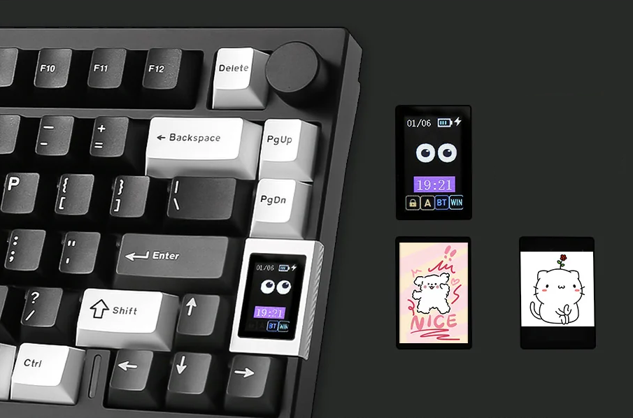 Batarya seviyesi, mod belirteci gibi çeşitli bilgilerin bulunduğu kişiselleştirilebilir LCD ekrana, Yunzii tarafından geliştirilmiş yazılım üzerinden istenilen resim ve GIF eklenebilir.